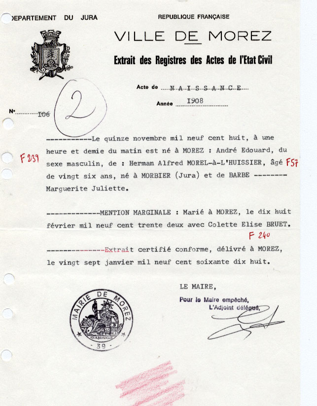 Morel à l'Huissier André-Edouard fils de Herman-Alfred et petit fils de Jean-Ernest