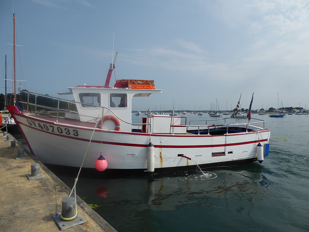Mardi 20 juin 2017 10h57: une journée de marche avec pique-nique. Aller-retour de l'île Tudy à Sainte Marine. (pas Le Pen). Nous avons besoin de traverser la rivière de Pont-l'Abbé. Ce petit rafiot fera l'affaire.