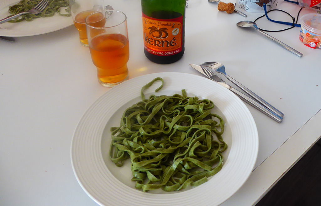 Mardi 20 juin 2017 19h35: le soir, rien de mieux pour reprendre des forces que des pâtes......aux algues!! (eh oui aux algues) et un verre de cidre..