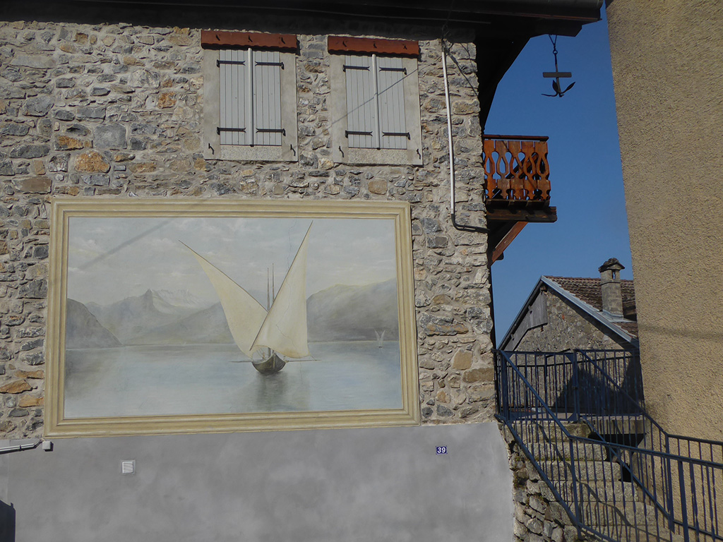 A Evian, un bateau sur un mur !! oui mais c'est "La Savoie" une barque de 35m à voiles latines construite en 1896 pour transporter divers materiaux.