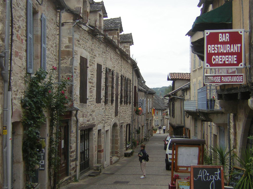 Najac, rue principale, en bas à droite aligot à 10 euros, qu'on se le dise ! ! ! sur la terrasse panoramique...