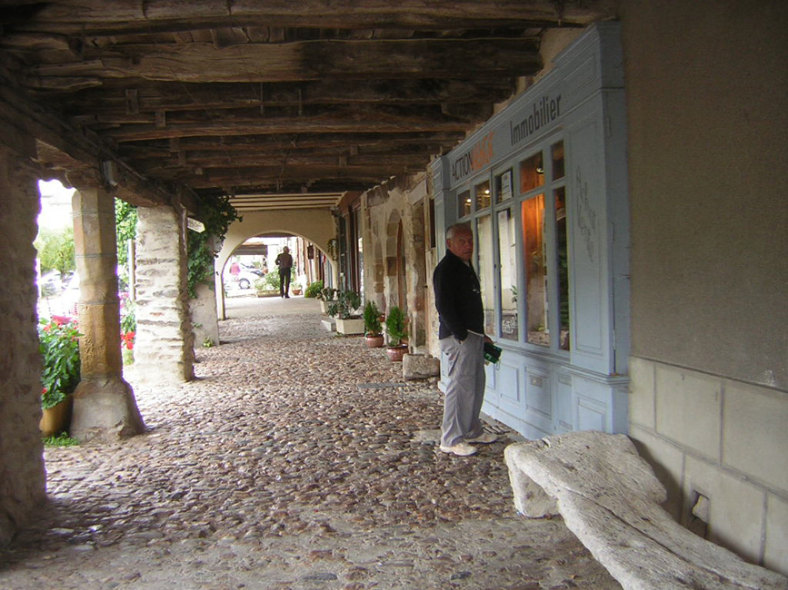 Najac, ses arcades et en bas à droite son banc d'époque !