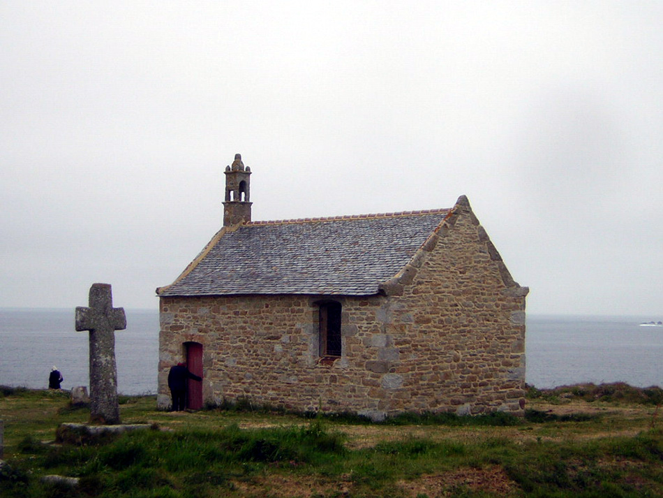 La chapelle St Samson sur fond de ciel gris et de mer d'iroise grise, demain il fera beau, cliquez ici