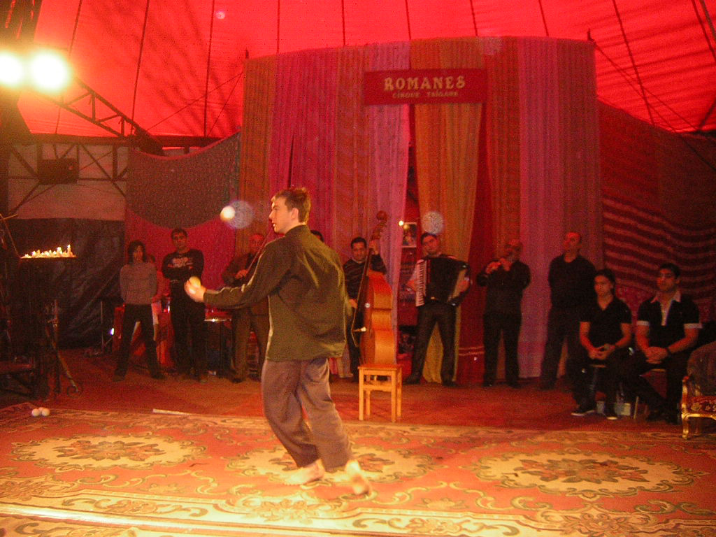 on jongle avec des boules de billard, au son d'un orchestre tzigane.