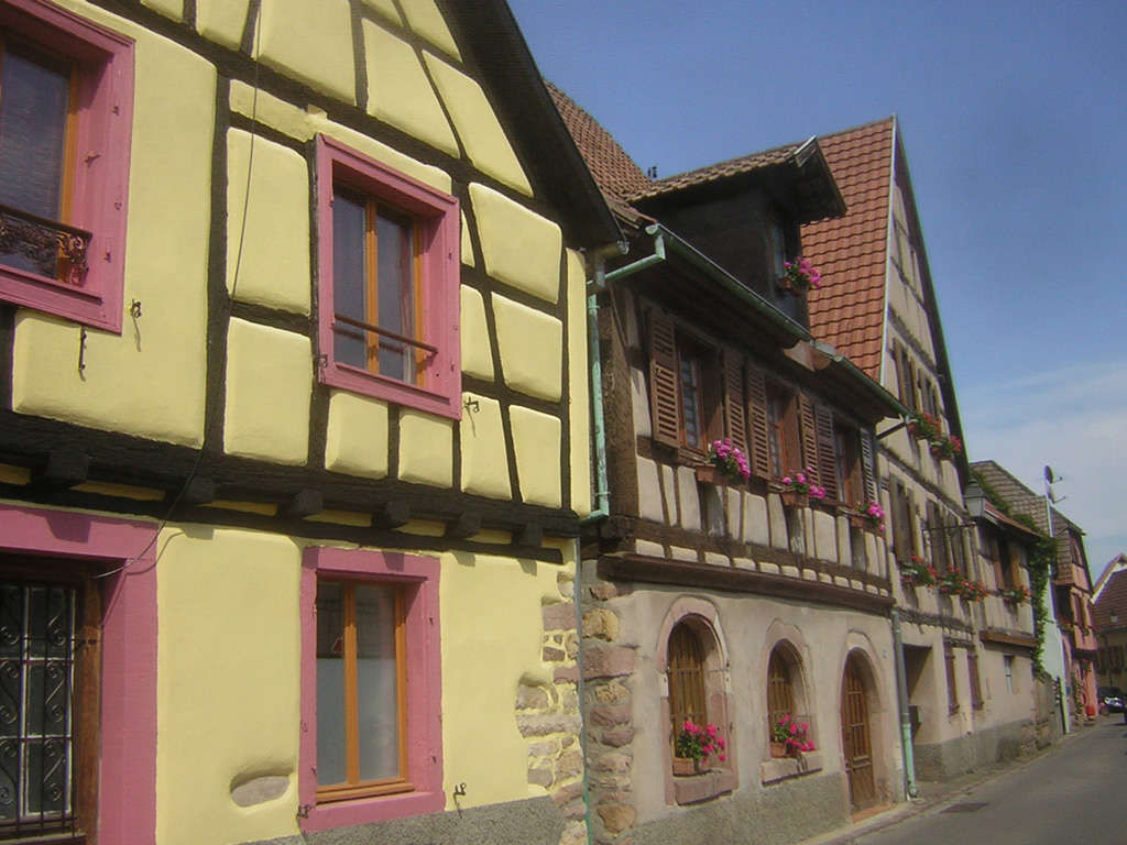 Sur la route des vins un bourg viticole ancien; Bergheim, maisons restaurées aux belles couleurs.
