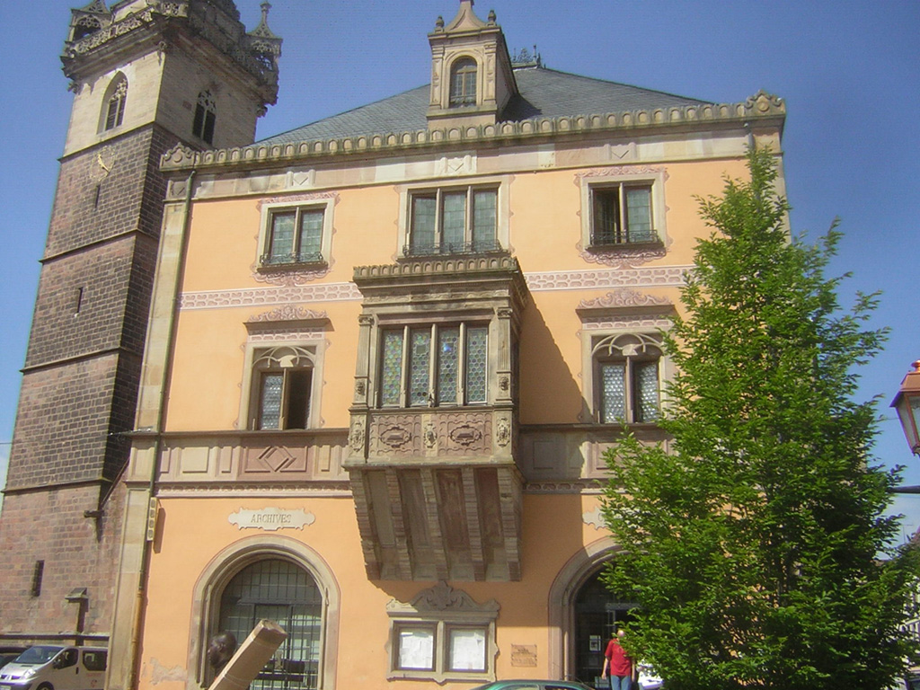 Obernai: l'hôtel de ville style néo-renaissance avec quelques vestiges,oriel et balcon sculpté de 1604. |