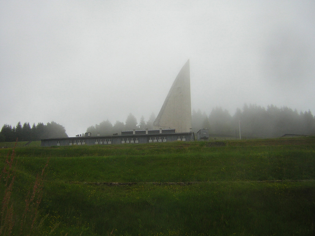 Le jour de notre visite pesait une atmosphère silencieuse, pesante en adéquation à la mémoire du lieu. Le mémorial au loin. |