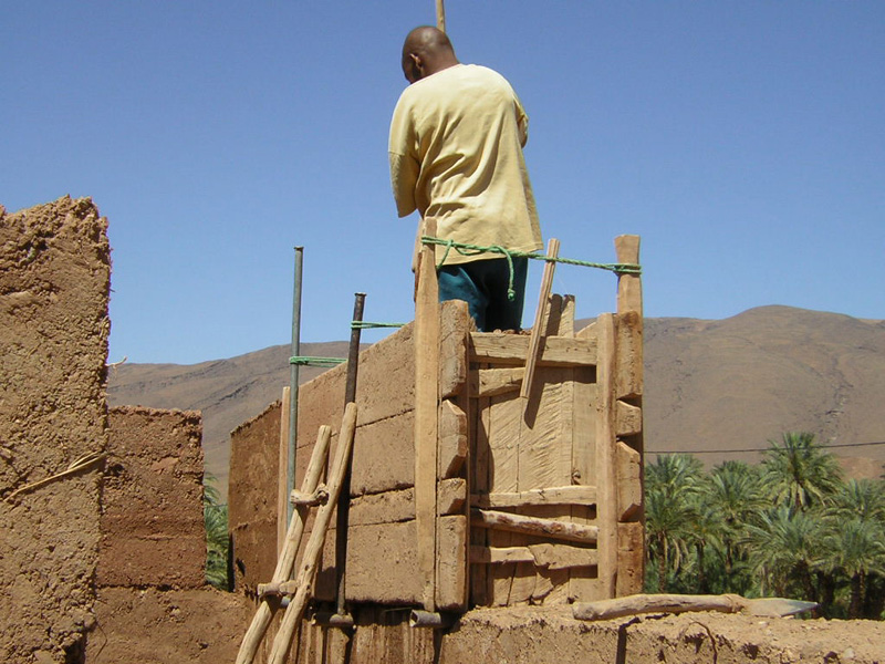 étape 2 la terre hissée manuellement est tassée, "damée" dans un coffrage. |