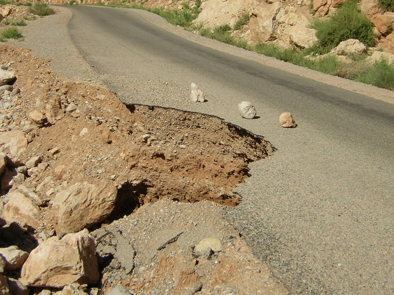 attention, chaussée rongée par les crues de l'oued, remarquer la signalisation ! |