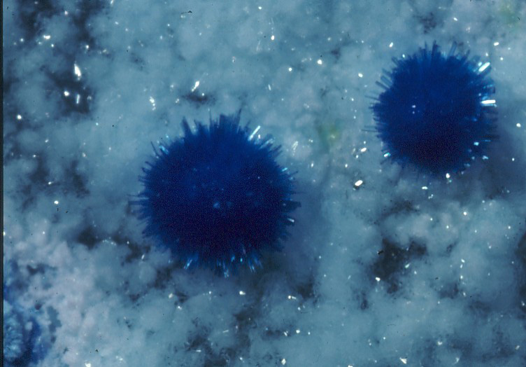 Il était une fois 2 magnifiques oursins bleu soutenu qui se promenaient sur un tapis de scorodite.