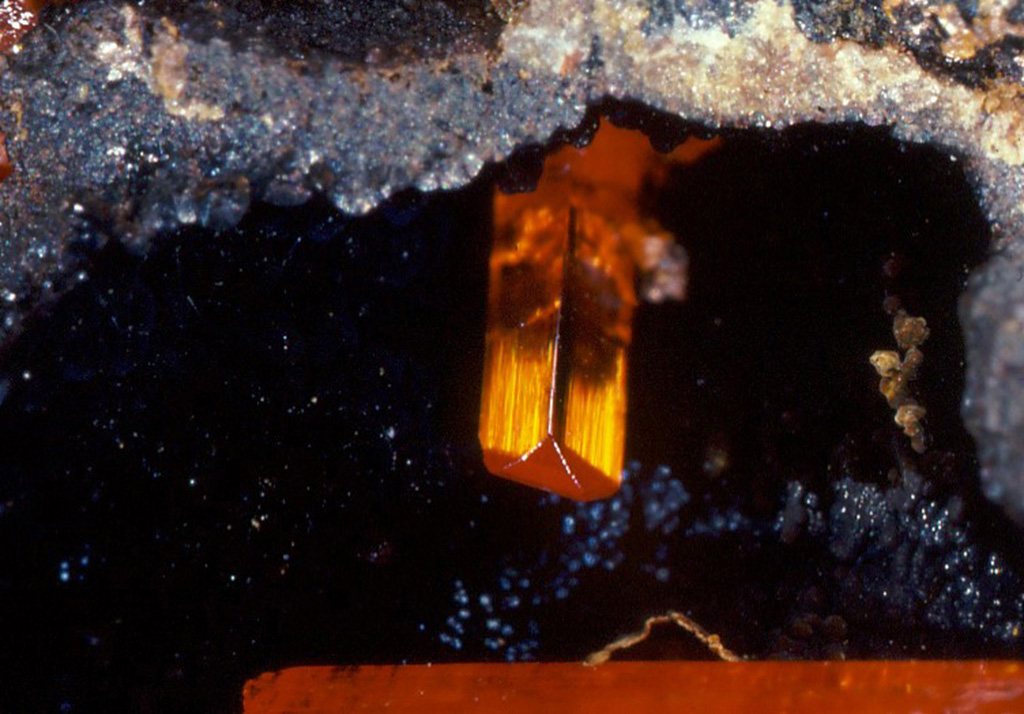 Crocoite de Dundas Tasmanie Australie, Un prisme noyé dans la masse mais mis en valeur par le savoir faire du photographe |