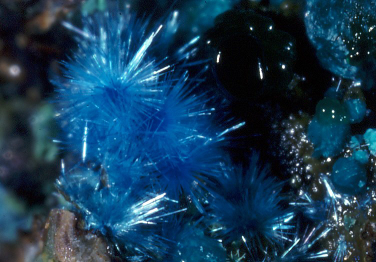 commentaires | La cyanotrichite est bleue, la cornubite c'est la boule vert foncé en haut sur la droite |