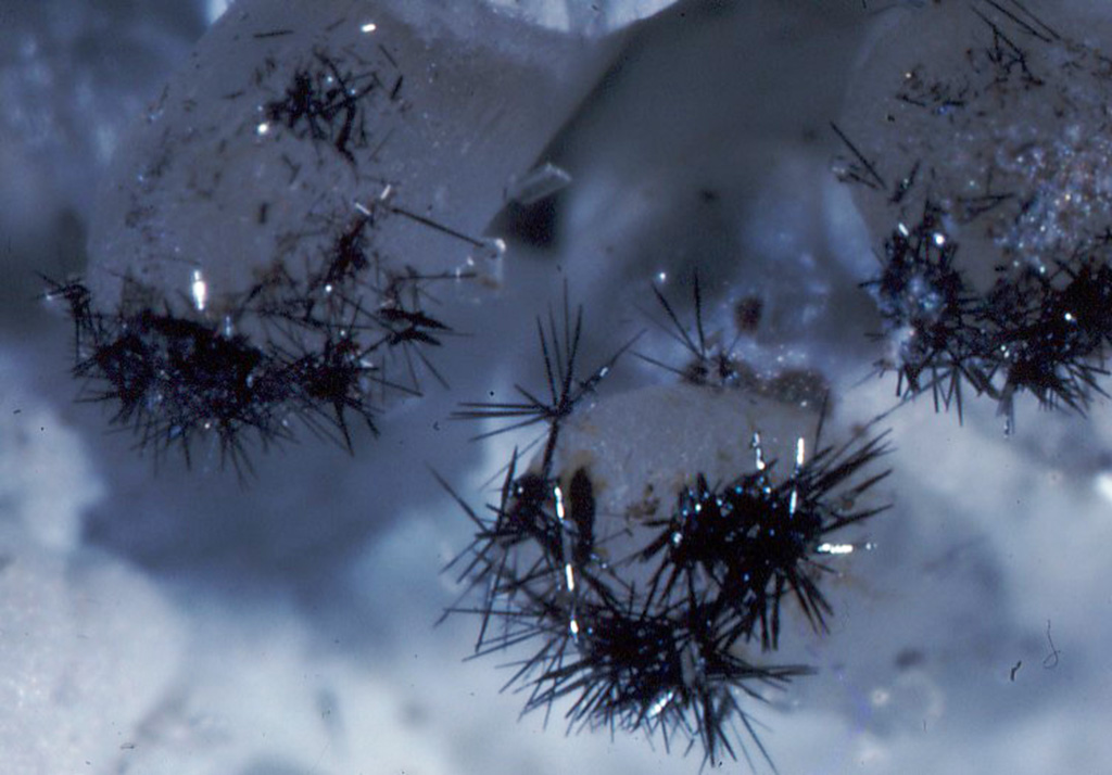 Plattnerite de Zozzone Bergame Italie, Des aiguilles plantées sur des boules blanches, étonnant ? |
