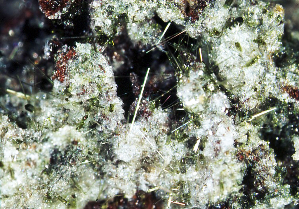 Diopside variété sahlite de Murol Puy de dome France, ce sont les petites aiguilles vertes. |